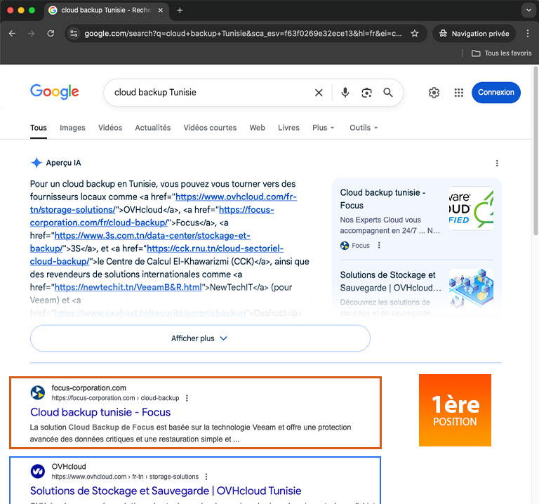 Grâce à cette stratégie précise et durable, Focus Corporation se classe aujourd’hui 1ʳᵉ sur Google pour « cloud backup Tunisie ».