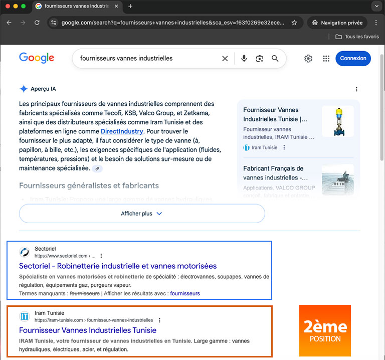 Grâce à ces actions ciblées, IRAM Tunisie figure aujourd’hui en 2ᵉ position sur Google pour la requête « fournisseurs vannes industrielles Tunisie ».
