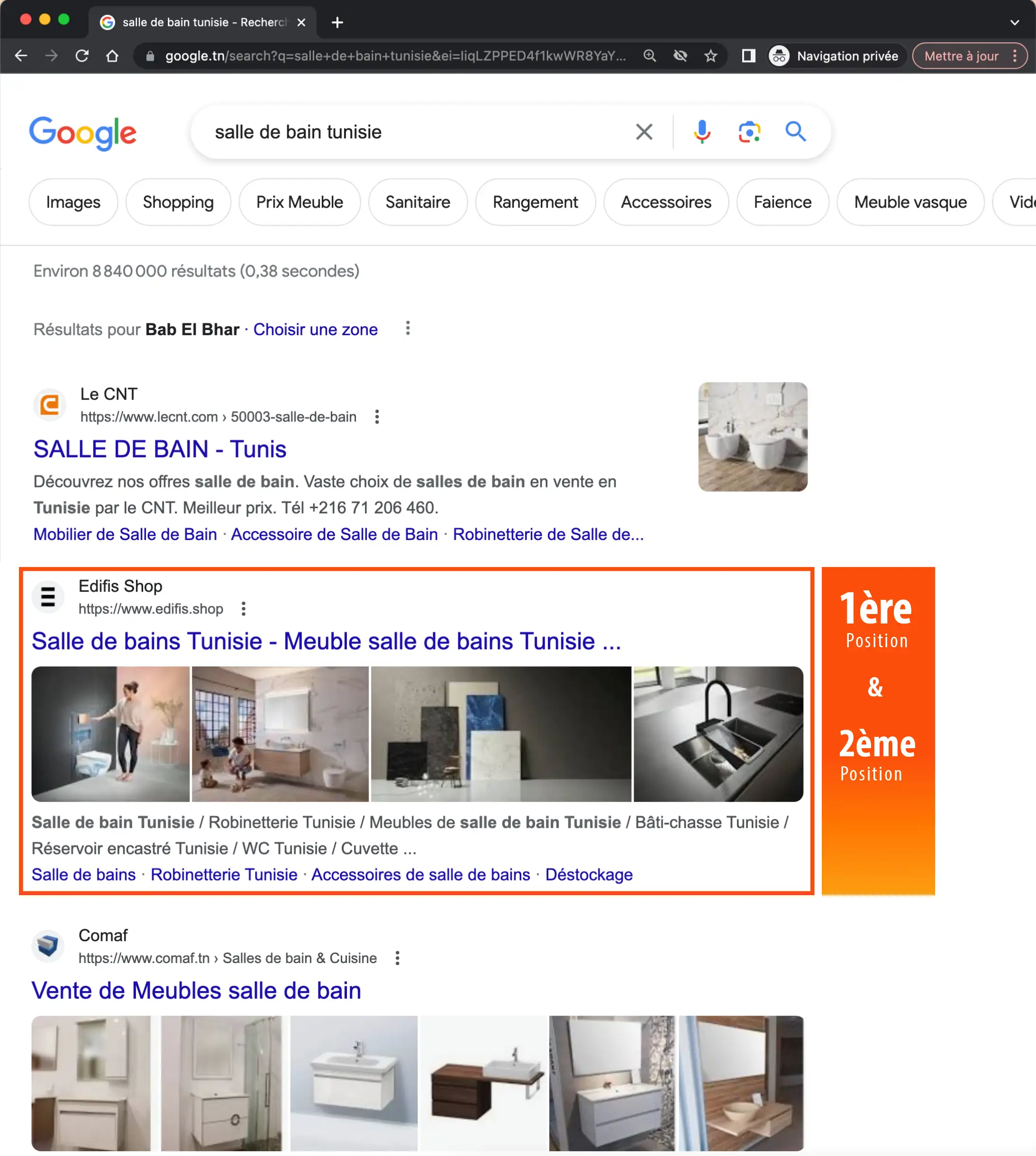 Edifis est spécialisé dans l’aménagement de salles de bains et de cuisines, et notre expertise en référencement nous permet de positionner Edifis en tête des résultats de recherche. Grâce à nos techniques avancées de SEO, nous optimisons la visibilité d’Edifis sur les principaux moteurs de recherche tels que Google, Bing et Yahoo pour un référencement Google plutôt pour avoir un référencement naturel en Tunisie remarquable.